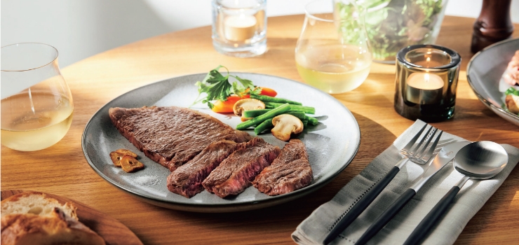きめが細かくやわらかなサーロイン。お好みの焼き加減で、脂身がほどよく甘く、コクのあるおいしさをおふたりでご堪能ください。
