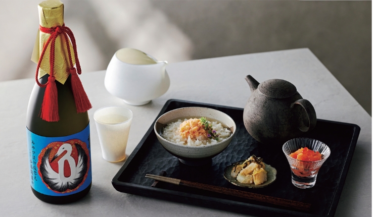 繊細な果実味と穏やかな酸味のバランスが絶妙。純米大吟醸酒らしい幾重にも重なる余韻が続きます。縁起の良い鶴と亀の押絵がお祝いのシーンを華やかに演出します。