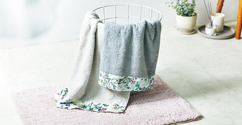 ヘム部分に花柄プリントをあしらったエレガントなデザイン。しっとりした肌触りは洗うほどにふっくら柔らかく。確かなジャパンクオリティーが魅力の今治タオルブランドから。